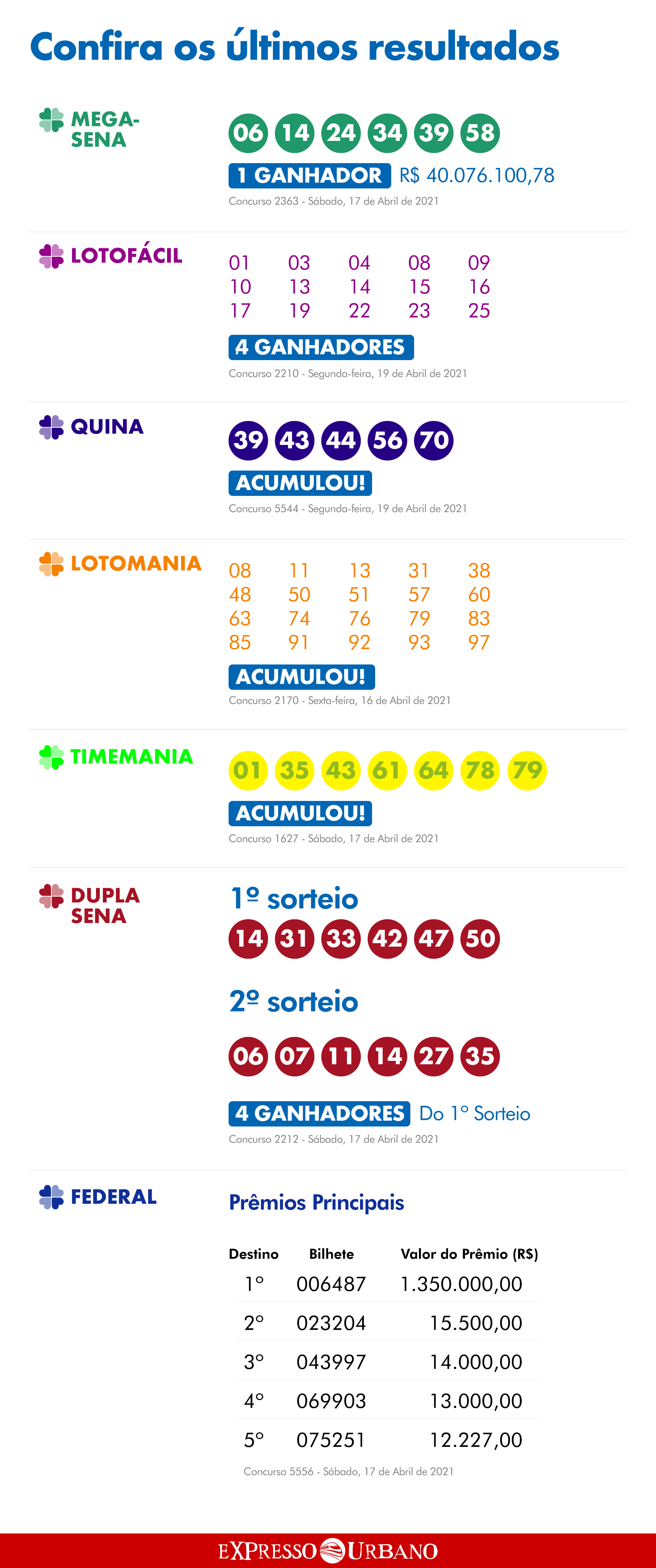 Informações não oficiais. O resultado de cada concurso deve ser confirmado diretamente com as organizadoras das loterias.