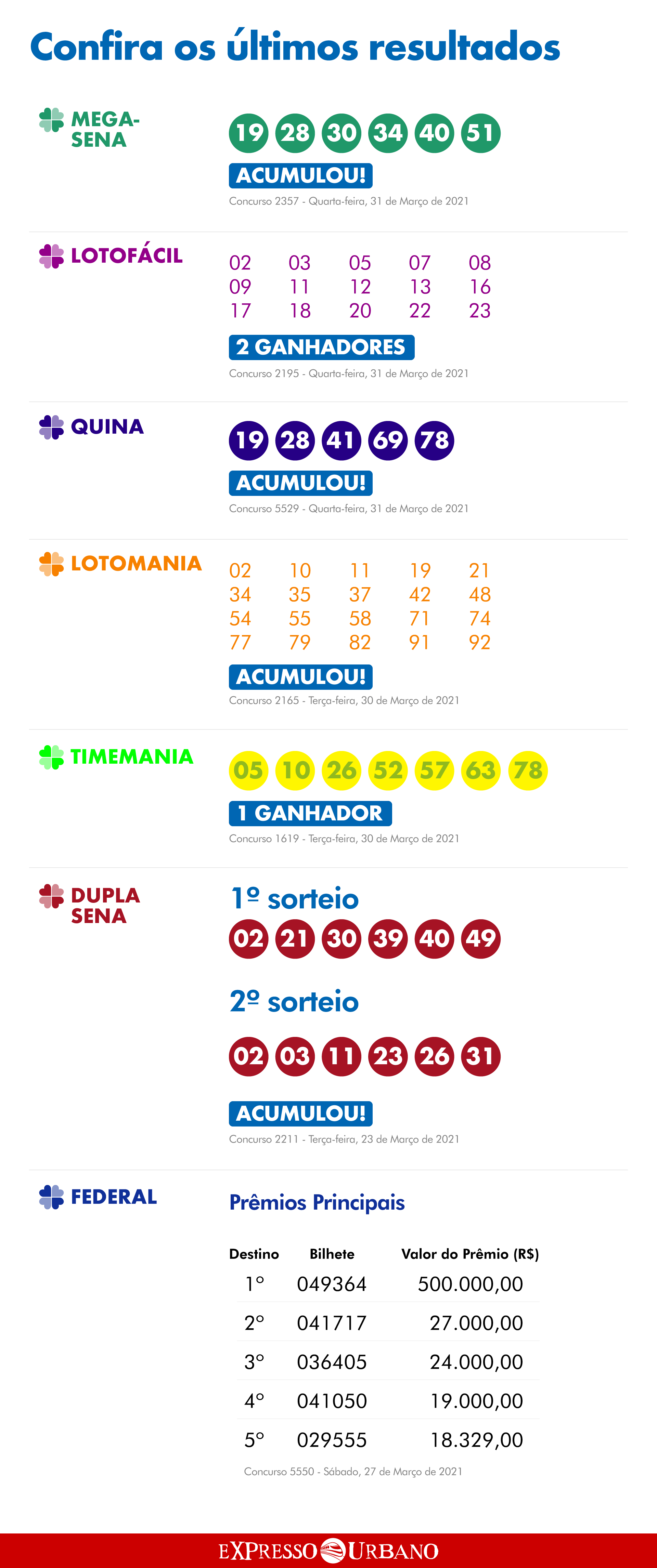 Informações não oficiais. O resultado de cada concurso deve ser confirmado diretamente com as organizadoras das loterias.