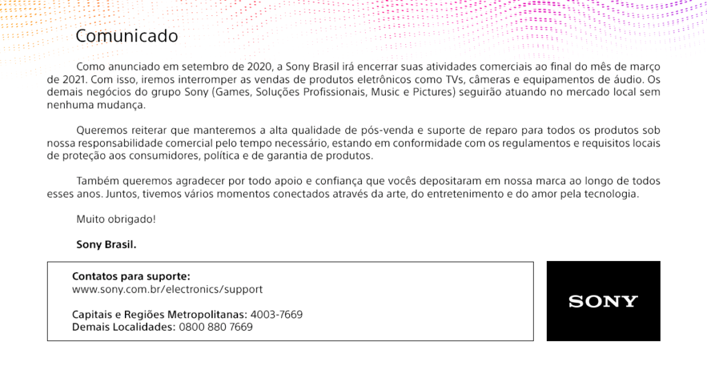 A japonesa Sony, uma das gigantes da tecnologia, confirmou oficialmente que vai interromper a fabricação de produtos eletrônicos no Brasil no final do mês de março. Outro anúncio sobre o assunto já havia sido feito pela empresa em setembro de 2020.