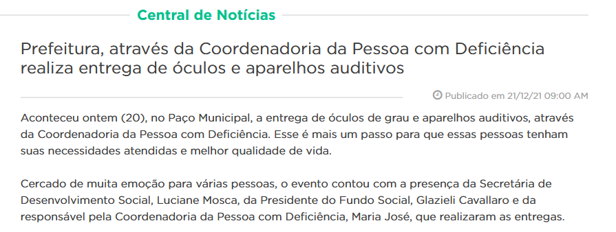 A pergunta que fica é: considerando o que é divulgado pelo prefeito em suas redes sociais, quais e quantas destas propostas, efetivamente, converteram-se em realidade em prol da emancipação e da valorização das Pessoas com Deficiência do município, a exceção da Semana da Pessoa com Deficiência, da criação de um Centro Paralímpico e da entrega de cadeiras de rodas, óculos e aparelhos auditivos?